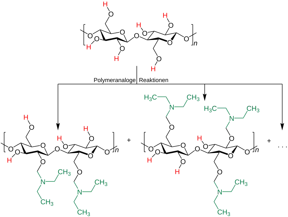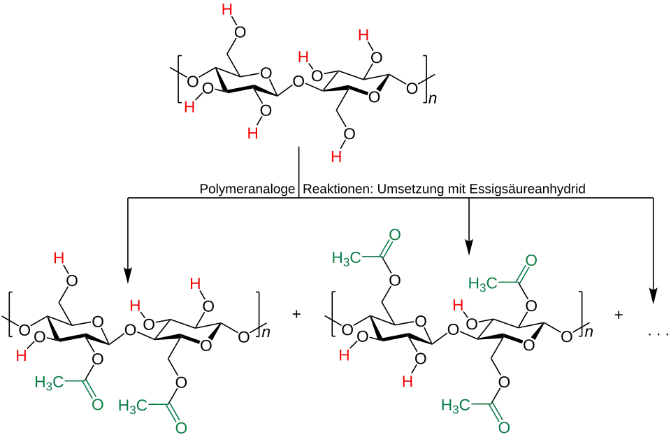 Polymeranaloge Reaktionen bei nativer, oder manchmal auch gezielt abgebauter Cellulose liefern wichtige Produkte der Kunststoffindustrie.