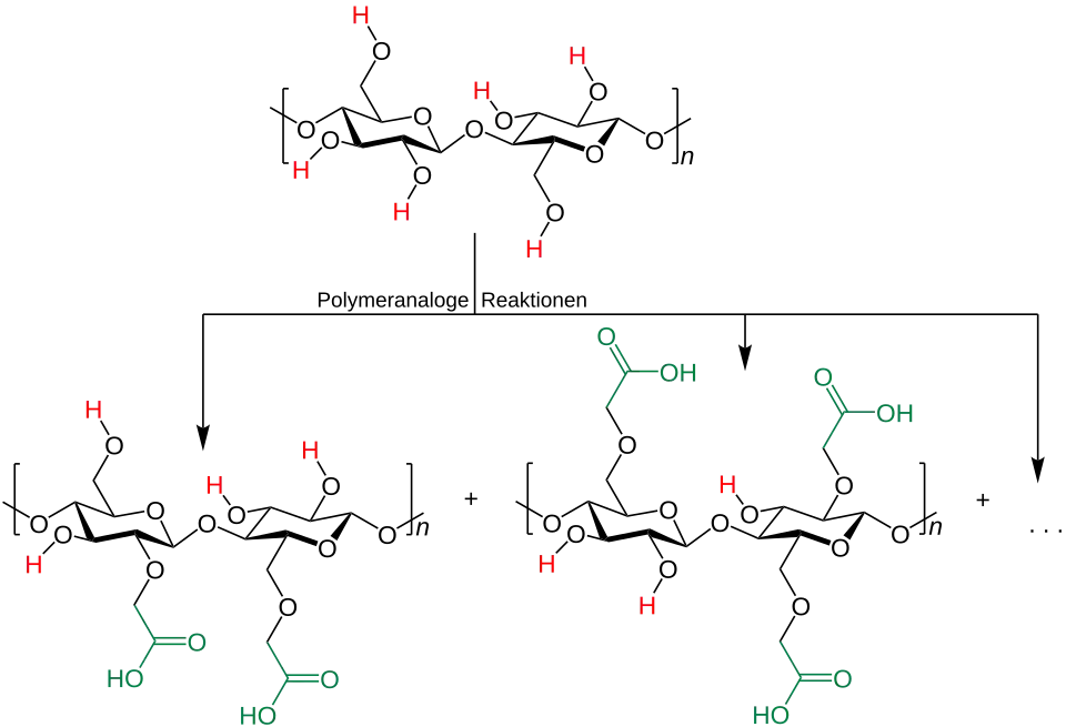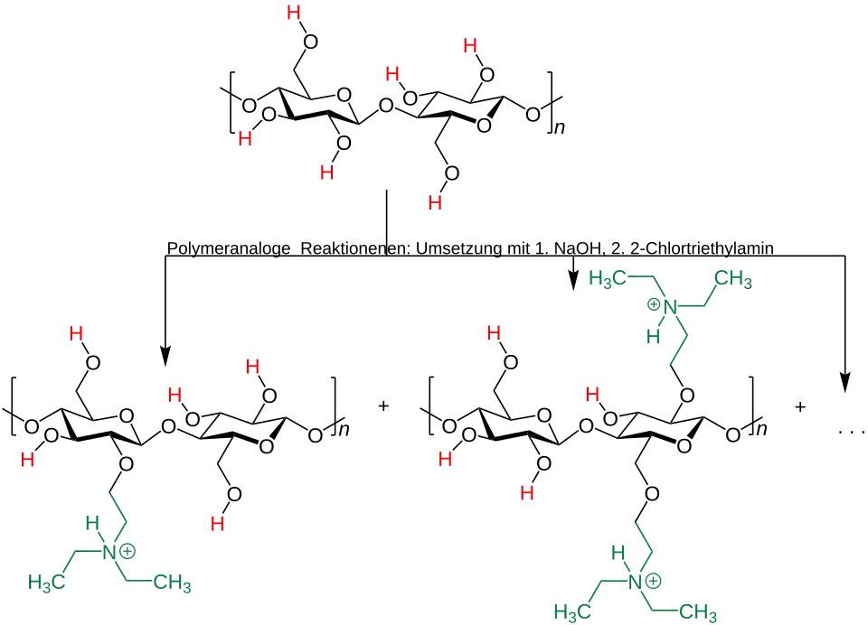 Bei der polymeranalogen Reaktion von Cellulose werden nicht alle Wasserstoffatome ersetzt, sondern es entstehen mehrere Reaktionsprodukte. Diese enthalten wie in den schemenhaften Abbildungen gezeigt unterschiedlich viele Ammoniumverbindungen und Carboxylatgruppen.