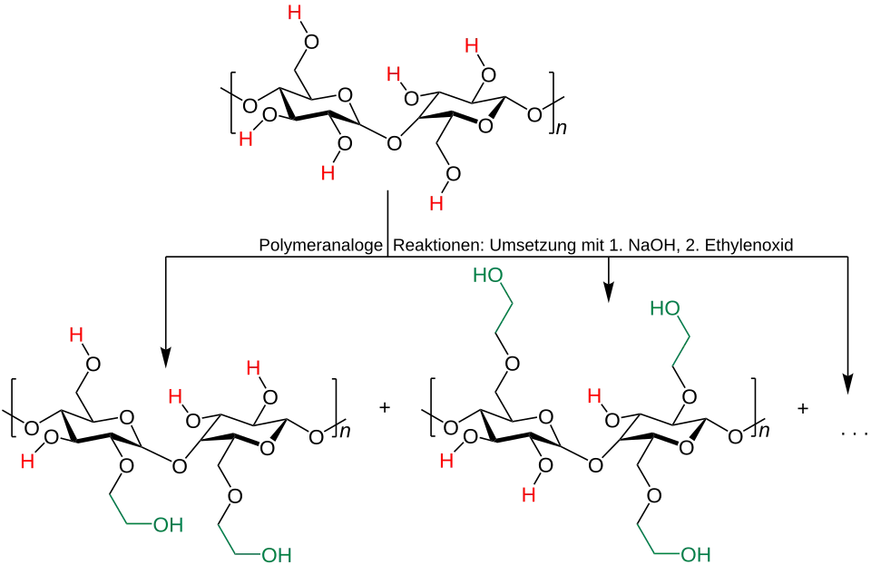 - Hydroxyethylcellulose[28] wird durch Umsetzung einer alkalisch vorbehandelten Cellulose mit Ethylenoxid hergestellt. Sie wird analog wie Hydroxypropylcellulose eingesetzt, ist aber (bei gleichem Substitutionsgrad) etwas hydrophiler als diese.