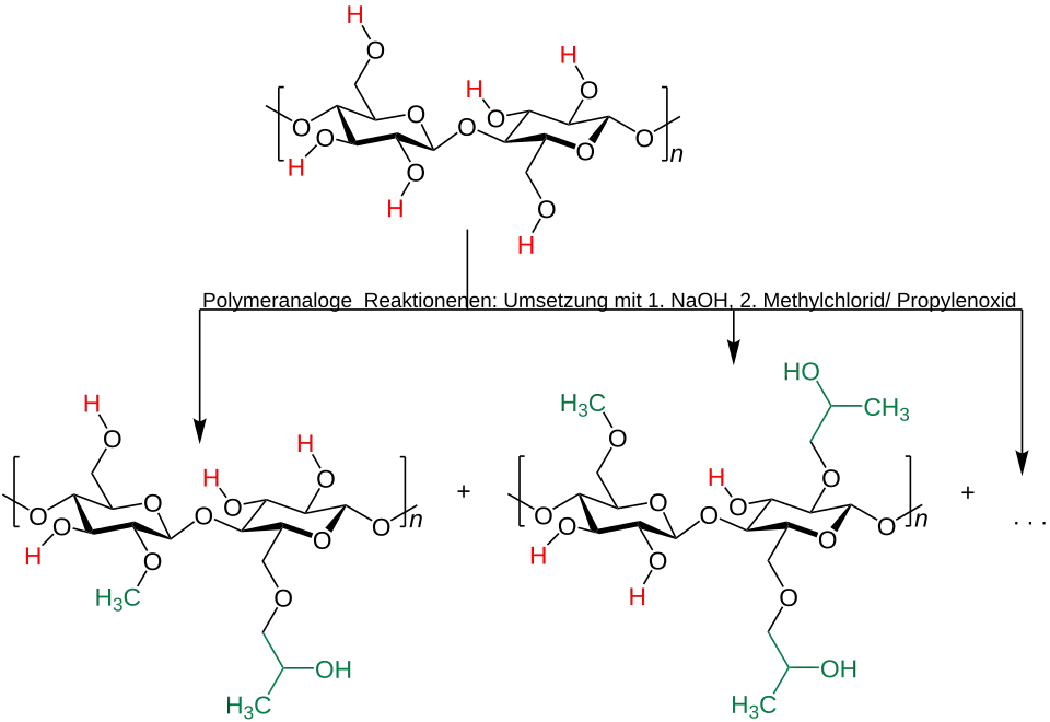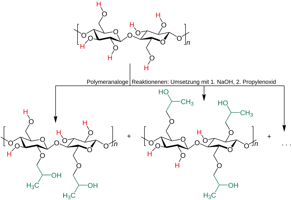 - Hydroxypropylmethylcellulose stellt man aus einer alkalisch vorbehandelten Cellulose mit einer Mischung aus Propylenoxid und Methylchlorid her. Die Verwendung ist vielfältig. Unter anderem wird sie als Verdickungsmittel[27] eingesetzt.