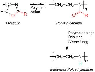 Mit p-Toluolsulfonsäuremethylester als Initiator lassen sich 2-alkyl-substituierte 2-Oxazoline zu N-substituierten Polyethylenimin polymerisieren. Nach Verseifung entsteht daraus ein lineares Polyethylenimin.[13]