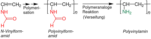 Polyvinylamin wird aus N-Vinylformamid hergestellt, das zu Polyvinylformamid polymerisiert und durch dessen Verseifung gewonnen wird.