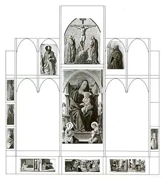 Schon im 16. Jahrhundert wurde der Altar demontiert und die einzelnen erhaltenen Tafeln befinden sich derzeit in London, Berlin, Neapel, Pisa und Los Angeles.[17]