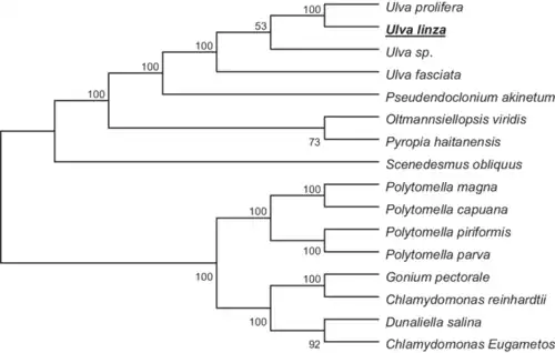 - ↑ Lingjie Zhou, Lingke Wang, Jianheng Zhang, Chuner Cai: Complete mitochondrial genome of Ulva linza, one of the causal species of green macroalgal blooms in Yellow Sea, China. In: Mitochondrial DNA Part B, Band 1, Nr. 1, 1. Februar 2016; doi:10.1080/23802359.2015.1137806. Bildquelle: ResearchGate.