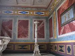 Am 20. August 1763 fand man einen Stein mit der Inschrift[29] „[…] rei publicae Pompeianorum […]“.[30] Damit war die Stadt ohne Zweifel als Pompeji identifiziert. Seit 1763 konnte man das Grabungsgebiet auch besuchen. Zu den ersten Schaustücken gehörten das Theater, der Isistempel, das Herculaner Tor und die Diomedesvilla vor der Stadt. Die neapolitanischen Könige Karl VII. und Ferdinand IV. beanspruchten das exklusive Vorrecht auf die gefundenen Schätze. So war es Besuchern verboten, die Ruinen zu zeichnen. Noch schlimmer für die spätere Forschung war, dass beide die Zerstörung von Wandmalereien anordneten, nur damit sich niemand ihrer bemächtigen konnte. Erst als Johann Joachim Winckelmann öffentlich protestierte, stellte das Königshaus dies ein. Nicht verhindert werden konnte, dass ausgewählte Stücke an andere europäische Königshäuser verschenkt wurden. Die Accademia Ercolanese publizierte zwischen 1757 und 1792 die achtbändige Reihe Antichità di Ercolano,[31] deren Prachtbände an ausgewählte Empfänger in ganz Europa verschenkt wurden. Dank dieser Bücher weiß man heute, welche Kunstschätze damals verlorengingen.