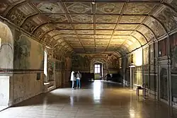 Hinzu kommt der aus dem 16. Jahrhundert stammende prunkvolle Rittersaal des Schlosses, der 1536 von Christoph Graf von Schernberg in Auftrag gegeben wurde. Die Decke des Saales besteht aus 107 zumeist quadratischen Feldern, die 137 Wappen enthalten. Die Wappen des Plafonds sind nach der Quaternionentheorie gestaltet, durch welche die ständische Hierarchie des Erzbistums Salzburg veranschaulicht wird. In den Hohlkehlen sind neben den acht Salzburger Suffraganbistümern (Regensburg, Freising, Passau, Brixen, seit 798 dem Salzburger Erzbischof als Metropolit unterstellt, Bistum Gurk seit 1072 von Erzbischof Gebhard gegründet, und die Eigenbistümer Bistum Chiemsee (1216), Bistum Seckau (1218) und Bistum Lavant (1218)) und den zwei infulierten Klöster St. Peter und Admont die 24 Mitglieder des Salzburger Domkapitels sowie 38 Angehörige des Salzburger landständischen Adels dargestellt. Der Wappenschild in der Mitte enthält ein Allianzwappen derer von Schernberg (aus einer goldenen Krone ein wachsendes silbernes Drachenhaupt mit Hals) und von Goldegg (in Rot eine goldene, aufsteigende Spitze).