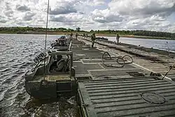 Pontoniere bei der Einrichtung einer Schwimmbrücke mit PMM-2-Brückenfähren