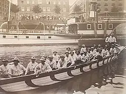 Als Pontoniere der Schweizer Armee wurden im 18. und 19. Jahrhundert vorwiegend Flösser, Fischer, Schiffer und Bauhandwerker eingesetzt, in Bern im Besonderen Bewohner der Matte und des Marzili.[2] Seit dem frühen 18. Jahrhundert war der Berner Schwellenmeister für die Kriegsbrücken zuständig, die Gesellschaft zu Schiffleuten war angehalten, Schiffer für das Rüsten von Schiffsbrücken zu entsenden.[3] Um 1860 bildete sich in Bern ein erster Pontonierverein.[2] Für das Jahr 1871 ist belegt, dass der Pontonierverein Bern ein Jahresfest mit Aarefahrt für die Bevölkerung abhielt.[4] Auf Initiative des Kantonalbernischen Genievereins wurde 1876 der Pontonier-Fahrverein der Stadt Bern als erster, durch das Eidgenössische Militärdepartement unterstützte Pontonierfahrverein der Schweiz gegründet, mit dem Ziel, die ausserdienstliche Ausbildung und Gewinnung von Nachwuchs zu fördern. Das war die eigentliche Geburtsstunde des Pontoniersports in der Schweiz.