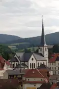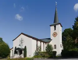 - Die katholische Pfarrkirche St. Georg wurde von 1609 bis 1621 erbaut. 1857–1861 wurde sie mit dem Bau eines Querschiffes und eines neuen Chores erweitert, 1993 bis 1994 im neugotischen Stil restauriert. Im Turm der Kirche befindet sich ein vierstimmiges Geläut von Bronzeglocken der Glockengießerei Otto aus Hemelingen/Bremen. Die Glocken haben die Schlagtonreihe d – fis – a – h und folgende Durchmesser: 1428, 1134, 953, 850.[16][17] Vor der Kirche befindet sich ein steinernes Hochkreuz aus dem Jahre 1763 sowie der Marktplatzbrunnen von 2015.