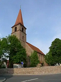 - Evangelisch-Lutherische Pfarrkirche St. Peter und Paul: Die Kirche war bis ins 13. Jahrhundert Mutterkirche von St. Sebald in Nürnberg. In ihrer heutigen Gestalt mit dem markanten Westturm geht sie in der Bausubstanz bis ins frühe 15. Jahrhundert zurück; der 1522 vollendete spätgotische Chor wird Hans Beheim d. Ä. zugeschrieben. Das Bild des Innern prägt eine doppelgeschossige, heute holzsichtige Langhausempore (1859/60). Im Chor steht ein spätgotischer Flügelaltar (Ende 15. und Anfang 16. Jahrhundert), der im 19. Jahrhundert in dieser Form als neugotisches Kunstwerk zusammengefügt wurde. Die farbigen Glasfenster im Chor wurden 1881/82 hergestellt, wobei in das linke Fenster Reste von Scheiben des 16. Jahrhunderts eingearbeitet wurden.[14]