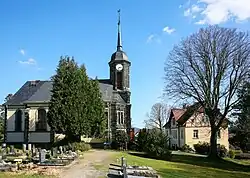 Die evangelische Kirche, aus dem vor Ort massig vorhandenen Sandstein wurde 1903/04 errichtet.