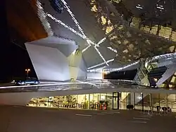 Das Gebäude mit 21.000 Quadratmeter Gesamtnutzfläche besteht aus einem sogenannten Basement, das bis zu vier Etagen umfasst, davon zwei Untergeschosse. Dieser Baukörper wurde in Stahlbeton mit 3.400 Tonnen Betonstahl als Weiße Wanne mit Flachdecken ausgeführt und ist auf 115 Bohrpfählen mit 1,2 Meter Durchmesser und bis zu 25 Meter Länge gegründet. Oberhalb vom Basement sind nur noch drei Kerngruppen, bestehend aus einem vertikalen Schacht mit den Aufzugsanlagen und zwei Kernen mit Stützen in Y-Form, vorhanden. Auf den drei Kernen ist das Ausstellungsgebäude, der sogenannte Flieger, mit 35.000 Tonnen Gewicht in maximal 16 Meter Höhe als Brückenbauwerk gelagert. Dieser bis zu 150 Meter lange Baukörper weist eine Stahlkonstruktion mit 5.500 Tonnen Masse auf. Er besitzt Spannweiten von bis zu 60 Meter zwischen den Kernen und Auskragungen mit bis zu 45 Meter.[7]