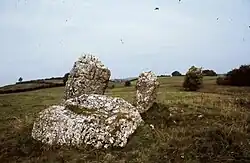 Das nach Süden ausgerichtete Portal Tomb steht am Südende eines ovalen Hügels von etwa 9,0 × 7,0 m Grundfläche und einer Höhe von 0,5 m. Es gibt einen 1,95 m hohen Portalstein im Westen, daneben liegt ein 0,45 m dicker Deckstein. Ein 1,4 m hoher Seitenstein steht an der Ostseite. Der 2,0 m lange östliche Portalstein liegt umgefallen an der Vorderseite der Kammer. Alle Steine sind aus Puddingstein. Etwa 8,0 m nordöstlich der Kammer befindet sich eine leicht gekrümmte, etwa 4,0 m lange Linie von fünf Steinen, die nicht in den Boden eingelassen sind und die Innenseite eines leichten Erdwalls bilden.