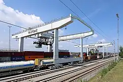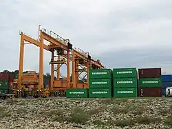 Fahrbare Portalkrane mit Gummibereifung, sogenannte Portalhubwagen, werden zur Verladung und zum Transport von Containern auf Containerlagerplätzen benutzt.