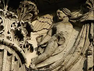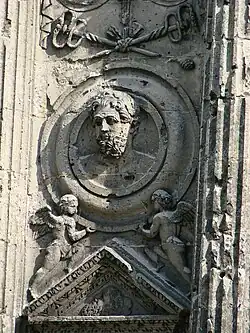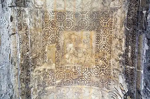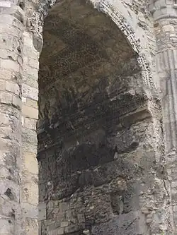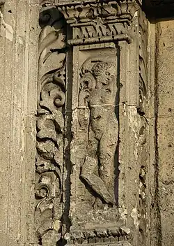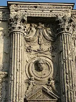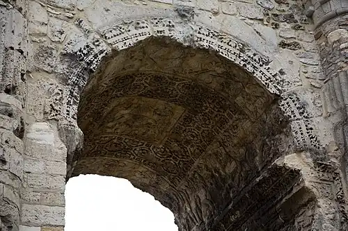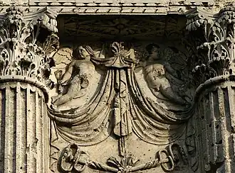 Auf der Außenseite der Bogenpfeiler sind korinthische Kapitelle angebracht, die unterhalb der Archivolte enden. In der Fläche über der Archivolte sind verschiedene Opferszenen dargestellt.