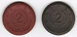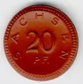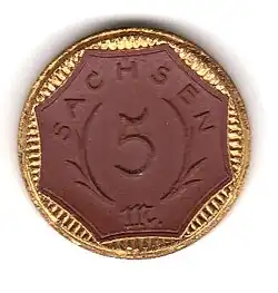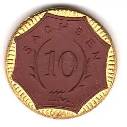 Von 1920 bis 1921 wurde in der Staatlichen Porzellanmanufaktur in Meißen aus Böttgersteinzeug und Biskuitporzellan Porzellangeld für viele Städte und Gemeinden in Deutschland hergestellt. Friedrich Wilhelm Hörnlein, Münzgraveur und Medailleur an der sächsischen Staatsmünze in Muldenhütten schnitt die Stahlstempel nach Entwürfen, die überwiegend Emil Paul Börner, Bildhauer und Maler aus Meißen lieferte.[1]