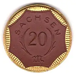 Zur Behebung des Mangels an Kleingeld wurde die Finanzhauptkasse ermächtigt, Geldersatzzeichen aus Meißner braunem Böttger-Steinzeug (Porzellan-Notgeld) bis zum Gesamtwert von 5 Millionen Mark auszugeben und durch staatliche Kassen ausgeben zu lassen, und zwar in Stücken zum Nennwerte von 20 Pfennig, 50 Pfennig, 1 Mark und 2 Mark. Mit der Verordnung des Finanzministeriums im Freistaat Sachsen vom 31. Dezember 1920 waren nur die Stücke mit der Jahreszahl 1921 als Geldersatzzeichen zugelassen. Alle Stücke mit der Jahreszahl 1920 sowie die Stücke von 5, 10 und 20 Mark mit der Jahreszahl 1920 und 1921 galten nicht als Geldersatzzeichen. Sie hatten lediglich Sammlerwert. Die Annahme als Ersatzwährung war mit der Verordnung bis zum 31. Dezember 1921 beschränkt.