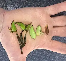 Mitte-Rechts: reife Früchte, die vom restlichen Teil der Pflanze gelöst sind und Samen freisetzen