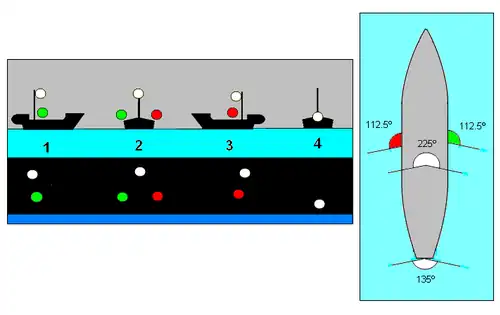 Die Seitenlichter (grün und rot) überstreichen dabei bei Wasserfahrzeugen einen Winkel von je 112,5°, bei Luftfahrzeugen von je 110°, das Hecklicht (weiß) bei Wasserfahrzeugen die verbleibenden 135° des Kreisbogens, bei Luftfahrzeugen entsprechend 140°.