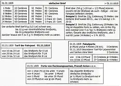 - Pakettaxe, je 4 Meilen und 1 Pfund (485 Gramm) 3 Centimes, Für Lebensmittel und Sachen ohne Wert nur 2 Centimes, mindestens aber doppeltes Briefporto.