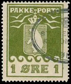 1905 wurden die Portogebühren für Pakete herabgesetzt, während zugleich Portogebühren für Päckchen und damit die ersten Briefmarken eingeführt wurden. Briefe blieben vorerst weiter portofrei.[2] Fortan kosteten Päckchen 1 Øre pro Pfund, mindestens jedoch 10 Øre. Es wurden pakkeportomærker genannte Marken im Wert von 1, 5 und 10 Øre herausgegeben, auf denen ein Eisbär abgebildet war. Das Motiv erschien erstmals 1666 auf dem Wappen Dänemarks, wurde für die Marken vom Grönländer Gerhard Heilmann (1859–1946) gezeichnet und ist heute auf dem Wappen Grönlands zu sehen.[3] Ab 1915 wurden auch Marken im Wert von 2, 15 und 20 Øre gedruckt.[4] 1930 wurden die Gebühren deutlich erhöht. Fortan wurden Marken im Wert von 1, 5, 10, 20, 70 Øre, 1 und 3 Kronen herausgegeben.[5]