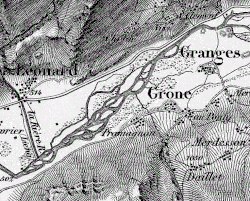 Weite Teile des Gebiets rund um das mittelalterliche, abgegangene Städtchen Granges, das auf einem markanten Burghügel lag, bestanden seit jeher aus Sumpf- und Riedflächen mit verstreuten Landwirtschaftsparzellen. Das Landschaftsbild vor der Flusskorrektion mit einer weiten Geschiebfläche ist auf der Siegfriedkarte von 1845 abgebildet. 1844 hatten die Franzosen Thomas Bunton und Thomas Nodler zum Schutz des Landes bei Granges mit Bewilligung des Kantons einen ersten kleinen Damm neben der Rhone und einen Entwässerungskanal, den Grand canal Nodler-Brenton, errichtet.[28] Die weiteren Ausgaben der Landeskarten der Schweiz nach der Mitte des 19. Jahrhunderts zeigen den Fortschritt der Rohnekorrektion[29][30] und lassen bei Grône noch die verzweigten Gerinne des Rhonebetts erkennen, aus denen seither der Sumpf von Poutafontana entstanden ist. Der grösste See ist der Lac de Brèche, der seinen Namen erhalten haben soll, weil die erst kurz zuvor kanalisierte Rhône an dieser Stelle im Jahr des schweren Hochwassers in der Schweiz 1868 den linken Seitendamm zerstörte und durch die Bresche die Ebene wieder einmal überschwemmte.[31]