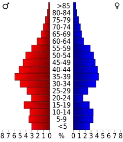 Auf das gesamte County bezogen setzte sich die Bevölkerung zusammen aus 24,0 Prozent Einwohnern unter 18 Jahren, 7,3 Prozent zwischen 18 und 24 Jahren, 34,7 Prozent zwischen 25 und 44 Jahren, 25,6 Prozent zwischen 45 und 64 Jahren und 8,4 Prozent waren 65 Jahre alt oder darüber. Das Durchschnittsalter betrug 37 Jahre. Auf 100 weibliche Personen kamen 122,3 männliche Personen. Auf 100 Frauen im Alter von 18 Jahren oder darüber kamen statistisch 126,7 Männer.