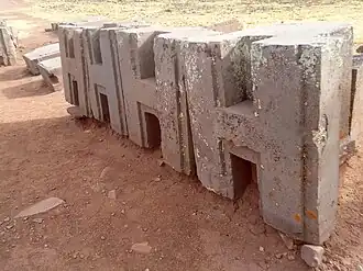 Pumapunku ist ein terrassierter Plattformhügel in Bolivien, auf dem sich eine in Ruinen liegende Monumentalstruktur befindet. Vertreter der Präastronautik glauben, Pumapunku sei direkt von Außerirdischen errichtet worden.[31] Atlantis- und Ufo-Enthusiasten verweisen auf die präzise zugerichteten Steinquader in der Hochebene des Altiplano, die ihrer Ansicht nach ein Geheimnis darstellen.[32] Die Pumapunku-Stil-Architektur gilt als einzigartig und zahlreiche Innovationen der Tiwanaku-Kultur, die sich im Pumapunku-Plattformhügel manifestieren, gelten als einzigartig und ohne Vorläufer in der (Anden-)Welt.[33][34] Es handelt sich bei den Steinarchitekturen von Tiwanaku und insbesondere Pumapunku nicht um simple Blöcke, sondern um Steine mit äußerst komplizierten Details (siehe Form und Zweck der Steinblöcke), die teilweise für heutige Steinmetze schwer replizierbar sind.[35]