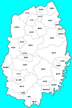 2015 gibt es noch 33 Gemeinden (shichōson) in Iwate (von über 200 1889 und noch knapp 60 im Jahr 2000): 14 [kreisfreie] Städte (-shi) – davon nur die Hauptstadt in einer Sonderform für Großstädte –, 15 [kreisangehörige] Städte (-machi/-chō) und vier Dorfgemeinden (-mura/-son). Von den zehn verbleibenden der (als geographische Einheiten weiterhin gebräuchlichen) ehemaligen Landkreisen (-gun) in Iwate bestehen sechs nur noch aus einer einzigen Gemeinde.