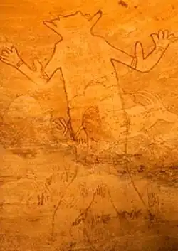 - Fresko von Séfar, Tassili: Sog. „Gorilla“ oder „Gott von Séfar“: Ein Phantasiewesen, dazu weiter Darstellungen von magischen Wesen.[75]