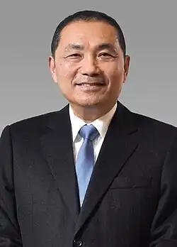 Am 17. Mai 2023 gab die Führung der Kuomintang (KMT), der bislang größten Oppositionspartei, bekannt, dass ihr Kandidat der amtierende Bürgermeister von Neu-Taipeh Hou Yu-ih sein werde.[19] Sein parteiinterner Hauptkonkurrent war der Unternehmer und Milliardär Terry Gou, der Gründer des Elektronikkonzerns Foxconn, gewesen. Auch der Parteivorsitzende Eric Chu, der schon 2016 kandidiert hatte, hatte zeitweilig eine Kandidatur betrieben, im Frühjahr 2023 jedoch seinen Verzicht erklärt. Als Basis für die Auswahl Hous hatte eine öffentliche Meinungsumfrage in der Zeit vom 5. bis 14. Mai 2023 gedient, die durch die KMT in Auftrag gegeben wurde. Diese Meinungsumfrage ergab Zustimmungsraten für Hou von 25,43 %, für Ko (TPP) von 25,27 % und für Lai (DPP) von 30,4 %. Damit lag Hou nur knapp vor Ko und deutlich hinter Lai. Terry Gou erzielte in der Umfrage jedoch noch etwas schlechtere Ergebnisse gegen die beiden anderen Kandidaten. Außerdem wurden durch die KMT die zusammengeführten Ergebnisse von 13 Umfragen zwischen dem 18. April und 14. Mai 2023 veröffentlicht, in denen Hou ebenfalls etwas besser als Gou abgeschnitten, aber auch nur knapp vor Ko und deutlich hinter Lai gelegen hatte. Unter den KMT-Parteimitgliedern und -funktionären waren die Verhältnisse jedoch anders und eine deutliche Mehrheit befürwortete die Kandidatur Hous gegenüber der Gous.[20] Am 23. Juli 2023 wurde die Nominierung Hous vom KMT-Parteikongress bestätigt.[21] Der gekürte Kandidat Hou entsprach nicht dem traditionellen Parteiestablishment der KMT. Er war ein Benshengren, d. h. seine Vorfahren waren Han-Chinesen, die schon vor 1945 auf Taiwan ansässig waren (die KMT war als Partei auf dem chinesischen Festland gegründet worden und nach 1949 vor den Kommunisten auf die Insel Taiwan geflüchtet. Ihr Führungspersonal rekrutierte sich lange Zeit fast ausschließlich aus den Waishengren, emigrierten Festlandchinesen, oder deren Nachkommen), und er stand zeitweilig der DPP politisch nahe. Als ein Pluspunkt Hous wurde gesehen, dass er innerhalb der KMT moderate Positionen vertrat und sich bei kontroversen Themen zurückhielt. Hou sprach sich gegen eine einseitige Unabhängigkeitserklärung Taiwans aus, lehnte aber auch das von der Volksrepublik China offerierte Modell „Ein Land, zwei Systeme“ und auch den sogenannten Konsens von 1992 ab, den der frühere (2008–2016) Präsident Ma Ying-jeou noch als Basis seiner Politik bezeichnet hatte.[20][22]