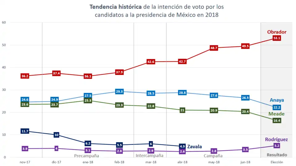 Als „historisch“ (Tagesschau) wurde die Wahl von López Obrador bezeichnet, da noch nie ein Präsidentschaftskandidat im demokratischen Mexiko in der ersten Runde mehr als die Hälfte der Stimmen erhalten hatte. Mit der Wahl ging auch eine seit fast hundert Jahren andauernde Dominanz der beiden bisher größten Parteien, der PRI und der PAN, zu Ende.[5]