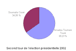 Die Abstimmung fand am 12. Mai friedlich statt, aber mit geringer Beteiligung. Die Ergebnisse wurden am 16. Mai bekannt gegeben und erst am 23. Mai vom Verfassungsgericht validiert, welches nach Annullierung von 268.216 Stimmen Amadou Toumani Touré mit mehr als 65 % der Stimmen zum Sieger erklärte.[5]