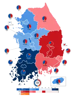 Der südkoreanische Präsident wird in direkter Wahl mit einfacher Mehrheit für eine einzige Amtszeit von fünf Jahren gewählt.[30][31] Er kann nicht wiedergewählt werden.[30] Der Präsident ist das Staatsoberhaupt und leitet die Exekutive, er wird durch den Premierminister vertreten und beaufsichtigt diesen.[30] Die Nationale Wahlkommission lädt relevante Informationen auf ihrer Internetseite hoch.[32]