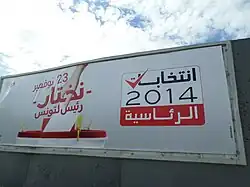 Um den Jahreswechsel 2010/2011 stürzte jedoch Ben Alis autokratisches Regime durch die tunesische Revolution; das Amt des Präsidenten wurde mit dessen Flucht am 15. Januar 2011 vakant und bis zu einer regulären Wahl interimistisch ausgefüllt.[2] Zunächst war geplant, bereits wenige Monate darauf eine Präsidentschaftswahl abzuhalten. Da jedoch im Lauf der Revolution die Verfassung außer Kraft gesetzt wurde, fehlten die Voraussetzungen für die Durchführung jeder Art von Wahlen. Der am 16. Januar bestimmte Interimspräsident Fouad Mebazaâ gab daher am 3. März bekannt, dass eine verfassunggebende Versammlung einberufen werden solle,[3] die, verzögert, am 23. Oktober 2011 gewählt wurde und die innerhalb eines Jahres eine Verfassung erarbeiten sowie die Präsidentschafts- und Parlamentswahl organisieren sollte. Es kam immer wieder zu Verzögerungen wegen ökonomischer Schwierigkeiten und politischer Verwerfungen, die sich im ersten Halbjahr 2013 durch die Ermordung der linken Oppositionspolitiker Chokri Belaïd und Mohamed Brahmi zuspitzten.[4] Die Wahlen, auf den 23. Juni 2013 angesetzt,[5] wurden nach Protesten gegen die Regierung zuerst auf den 17. Dezember[6] und dann ins Jahr 2014 verschoben, als die Regierung Ali Larajedhs Ende 2013 wegen des öffentlichen Drucks den Weg zu einer Technokratenregierung freimachte und die neue Verfassung der Republik Tunesien am 27. Januar 2014 von der verfassunggebenden Versammlung verabschieden ließ.[7] Unter dem neuen Premierminister Mehdi Jomaâ wurde die Präsidentschaftswahl auf den 23. November 2014 gelegt.[8]