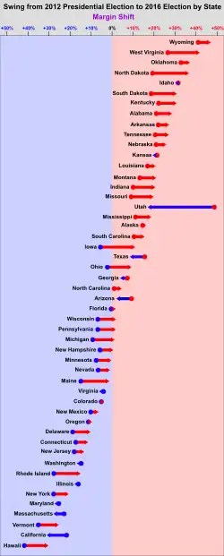 - ↑ 2016 November General Election Turnout Rates. In: United States Elections Project. Dr. Michael P. McDonald, abgerufen am 1. März 2017 (englisch, Die unterschiedliche und zwischen den einzelnen US–Bundesstaaten abweichende Datenlage bzw. Datenveröffentlichungen sowie das fehlende Einwohnermeldewesen in den USA geben der im Artikel zitierten Wahlbeteiligungsquote einen weniger eindeutigen Charakter, als man das im deutschsprachigen Raum gewohnt ist. Die angegebene Wahlbeteiligungsquote ist also ein (bloß) geschätzter Wert. So veröffentlicht das United States Elections Project in der hier verlinkten Quelle auf abweichender – weniger präferierter – Grundlage auch abweichende Wahlbeteiligungsquoten von 59,3 % (VEP Highest Office) und 54,7 % (VAP Highest Office). Im Artikeltext wurde der präferierte Wert übernommen.): „Turnout Rates · VEP Total Ballots Counted · 60,2 %“