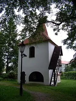 - Gemauerter Glockenturm an der Friedhofsmauer. Er wurde 1575 auf Veranlassung der Witwe des Píseker Bürgers Jiří Kahoun an einem der Eingänge errichtet. Die im selben Jahr von der Prager Glockengießerwerkstatt Brikcí von Cinperk gegossene Glocke wurde nach der Aufhebung des Friedhofes zunächst in den Turm der Dechaneikirche Mariä Geburt gehängt und kam später in die Klosterkirche der Kreuzerhöhung.[6]