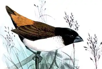 Der Kopf, die Kehle und der Hals sind schwarz gefiedert. Der Rücken und die Flügeldecken sind kastanienbraun, wobei bei den einzelnen Unterarten die Intensität dieses Kastanienbrauns etwas variiert. Die Schwingen sind schwärzlich mit kastanienbraunen Außenfahnen. Die Oberschwanzdecken sowie die Säume der dunkelbraunen Schwanzfedern sind gelblich ockerfarben bis gelb. Der Kropf und die vordere Körperunterseite sind je nach Unterart weiß bis rötlich hellbraun. Die Schenkel, der Hinterbrauch und die Unterschwanzdecken sind dagegen schwarz. Die Augen sind braun bis schwarz mit einem gegenüber dem schwarzen Kopfgefieder deutlich abgesetzten blassgrauen Lidrand. Der Schnabel ist blass grau bis schwärzlich grau.
