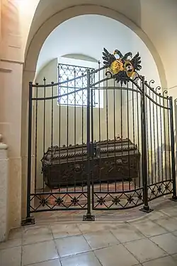 - Die Stele links ist dem Seligen Kaiser Karl I. gewidmet und wird von einem Abguss seiner Totenmaske bekrönt. In ihrem Inneren wird eine Reliquie des Seligen verwahrt. Die Basisinschrift lautet:
