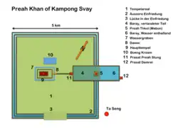Die äußere annähernd quadratische Einfassung ist an jeder Seite über vier Kilometer lang. Innerhalb liegen vier Tempelgruppen und zahlreiche Nebengebäude, einige Tempel befinden sich auch außerhalb dieses Bereichs. Ein drei Kilometer langer Baray erstreckt sich quer über die Umfassung zur Hälfte nach Osten hinaus. Er liegt bis auf einen größeren See im östlichen Bereich trocken. Direkt am Ostende des Baray steht, von einer Lateritmauer umgeben, der kleine Prasat Preah Damrei („Elefantentempel“) aus dem 9. Jahrhundert. Die freistehende Steinskulptur eines Elefanten wird von der lokalen Bevölkerung verehrt, ein weiterer Elefant blickt aus der Südostecke der Umfassungsmauer. Sehenswert sind die Reliefs an den Außenwänden, die Nagas mit Garuda und Apsaras (himmlische Nymphen) zeigen. Auf beiden Seiten des Osteingangs stehen lebensgroße Devatas (niedere Himmelsgöttinnen zur Bewachung).