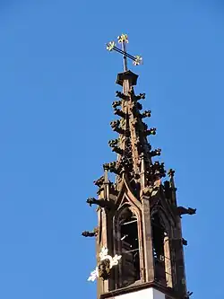 Der kleine Dachreiter aus Holz wurde 1423 durch einen steinernen Glockenturm mit offener, wimpergbekrönter Laterne und einem durchbrochenen Maßwerkhelm in Miniaturformat ersetzt, an dem mit Blick nach Norden und Süden je ein Christuskopf angebracht ist. Als entwerfender Baumeister ist Meister Johannes, genannt Cun, Steinmetz von Ulm, Meister des Werks und der Baufabrik der Ulmer Pfarrkirche genannt, die Ausführung vor Ort lag in den Händen seines Parliers Hans Böfferlin.[1]