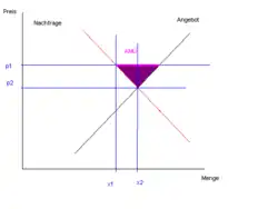 Der Preis eines knappen Gutes ist größer als null, der eines freien Gutes ist null.[22] Preise werden vom Anbieter gefordert („Angebotspreis“), vom Nachfrager geboten („Nachfragepreis“) oder am Markt akzeptiert (Marktpreis). Der Anbieter kann zwar seinen Angebotspreis und der Nachfrager seinen Nachfragepreis verlangen, jedoch ist dadurch noch kein Marktpreis entstanden. Vielmehr müssen sich Nachfrager bzw. Anbieter finden, die diesen Preis akzeptieren.[23] Konsumenten willigen oft ohne Preisverhandlung in die Preisforderung des Verkäufers ein (so genanntes konkludentes Handeln). Der Preis, der auf einem freien Markt zwischen mehreren Anbietern und Nachfragern zum Marktgleichgewicht zwischen Angebot und Nachfrage führt, wird als Marktpreis oder Gleichgewichtspreis bezeichnet. Bei den Produktionsfaktoren heißt der Preis Lohn (beim Produktionsfaktor Arbeit), Zins (Kapital) und Bodenrente (Boden). Weitere Preise sind die Tarife (bei der Energieversorgung), Miete (beim Mietvertrag), Pacht (beim Pachtvertrag) oder Gebühren (bei öffentlichen Unternehmen).[24] Auch die Kurse wie Devisenkurse oder Aktienkurse gehören zu den Preisen. Während der Preis für den Nachfrager oder Besitzer Kosten darstellt, ist er für den Anbieter oder Verkäufer ein Umsatzerlös oder Ertrag. Beim Faktor Arbeit sind dies Personalkosten/Arbeitseinkommen, beim Kapital sind es Kreditzins/Habenzins, beim Boden der Bodenertrag (Früchte aus Ernte und Bodennutzung).