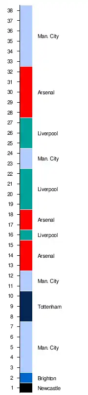 Seit Saisonbeginn an konkurrierten Arsenal, Manchester City, Tottenham, Aston Villa und der FC Liverpool um die Tabellenspitze. Die meisten direkten Aufeinandertreffen endeten unentschieden und teilweise konnte eine der Mannschaften nur über zwei Spieltage die Spitzenposition verteidigen. Durch ein 3:3 gegen den Vierten, Aston Villa, schied Liverpool bei gleichzeitigen Siegen der beiden Konkurrenten Manchester City und Arsenal am vorletzten Spieltag aus dem Meisterschaftsrennen aus. In den finalen Spieltag ging Manchester City, das zuhause gegen West Ham spielen musste, mit zwei Zählern mehr als der FC Arsenal, der im heimischen Stadion auf den FC Everton traf. Beide Konkurrenten gewannen, weshalb Manchester City seinen Titel verteidigen konnte.