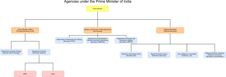 Einige spezifische Ministerien/Abteilungen sind niemandem im Kabinett zugeordnet, sondern dem Premierminister selbst. Der Premierminister ist in der Regel immer der Verantwortliche/Leiter des: