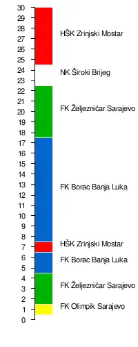 | 1. | HŠK Zrinjski Mostar | 30 | 18 | 7 | 5 | 56:21 | +35 | 61 |