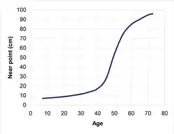 Mittlere Akkommodationsbreite und Nahpunkt bestehen in Abhängigkeit vom Lebensalter (nach Augustin, 2007[4]). Nach Duane sind die Werte der Akkommodationsbreite höher und die Nahpunkte liegen näher.