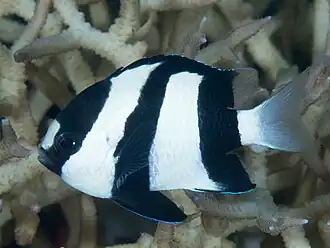 Dreibinden-Preußenfisch (Dascyllus aruanus), die Typusart der Gattung | ||||||||||||