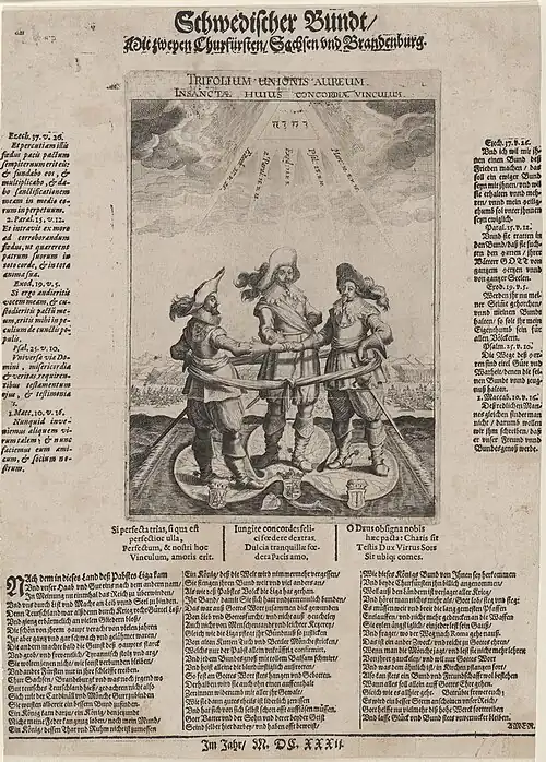 Der Kaiser hatte ein Übergewicht im Reich erzielt und erließ im Rahmen einer Rekatholisierungspolitik das Restitutionsedikt. Das bislang kaisertreue Sachsen war durch die autoritäre Kaiserliche Politik abgeschreckt. Es hatte Schlüsselpositionen in Norddeutschland verloren und drohte nun zu einem Verfügungsobjekt kaiserlicher Herrschaftsansprüche degradiert zu werden. Die ängstliche auf den Horizont des eigenen Territorialstaats einschränkende Neutralitätspolitik war nicht mehr ausreichend.[27] Sachsen begann nun eine aktive reichsständische Bündnispolitik zu betreiben, die es zuvor jahrzehntelang trotz Anfragen und Bitten verweigert hatte. Damit wollte es verhindern, zwischen den europäischen Mächten zerrieben zu werden. Auch Brandenburg, das 1626 ins kaisertreue Lager gewechselt war, litt unter der Rücksichtslosigkeit kaiserlicher Heere auf seinem Gebiet. Durch die Landung des schwedischen Heeres in Norddeutschland im Juli 1630 entstand eine neue militärische Lage. Schwedens Heer drohte beiden Staaten von Norden her, während kaiserliche Truppen vom Süden nach Norden zogen. Es setzte in der Folge eine rege Diplomatie auch zwischen beiden Staaten ein.