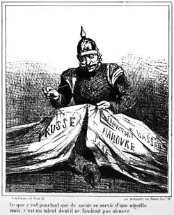 Vor allem die Integration Hannovers in Preußen machte Bismarck Sorgen. Zivilkommissar Hans von Hardenberg hielt die Hannoveraner für weniger umgänglich als die Sachsen in den Gebieten, die 1815 zu Preußen kamen. Sie hätten ein starkes Nationalgefühl, nicht einfach nur Preußenhass. Vor der Ankündigung, dass Hannover annektiert werden sollte, übernahm Hardenberg den Polizeiapparat und ließ in allen größeren Städten die preußischen Garnisonen verstärken.[43]