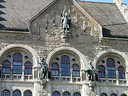 Das preußische Regierungsgebäude wurde 1902 bis 1905 im neuromanischen Stil unter Leitung des Berliner Baurats Paul Kieschke und des Koblenzer Bauamts erbaut. Damit verbunden ist das villenartige Wohnhaus des Regierungspräsidenten mit Festsaal an der Südseite. Kaiser Wilhelm II. nahm 1902 eigenhändige Planänderungen an Türmen und Dächern vor,[2] womit er eine Anknüpfung an die als Vorbild nationaler Größe angesehene Stauferzeit herstellen wollte. An der Nordseite schließt sich ein 1904 bis 1905 errichteter Erweiterungstrakt an, der das Hauptsteueramt aufnahm.